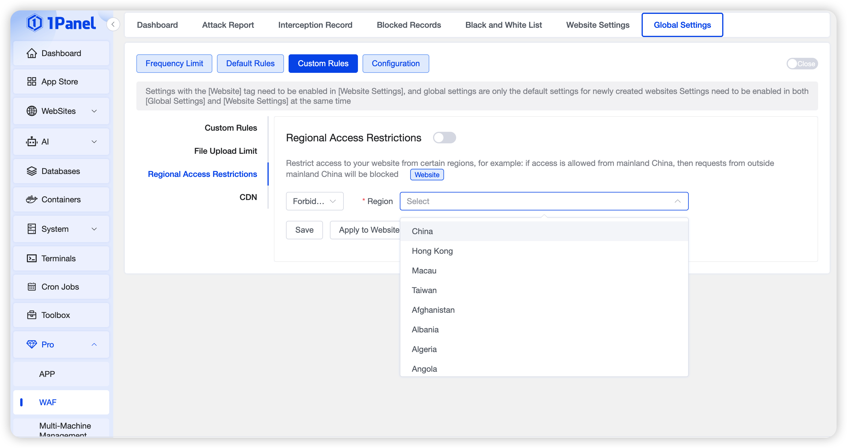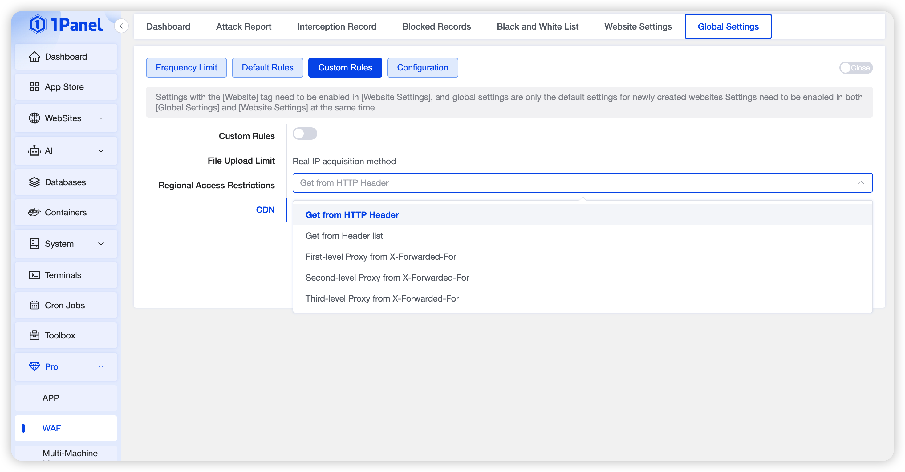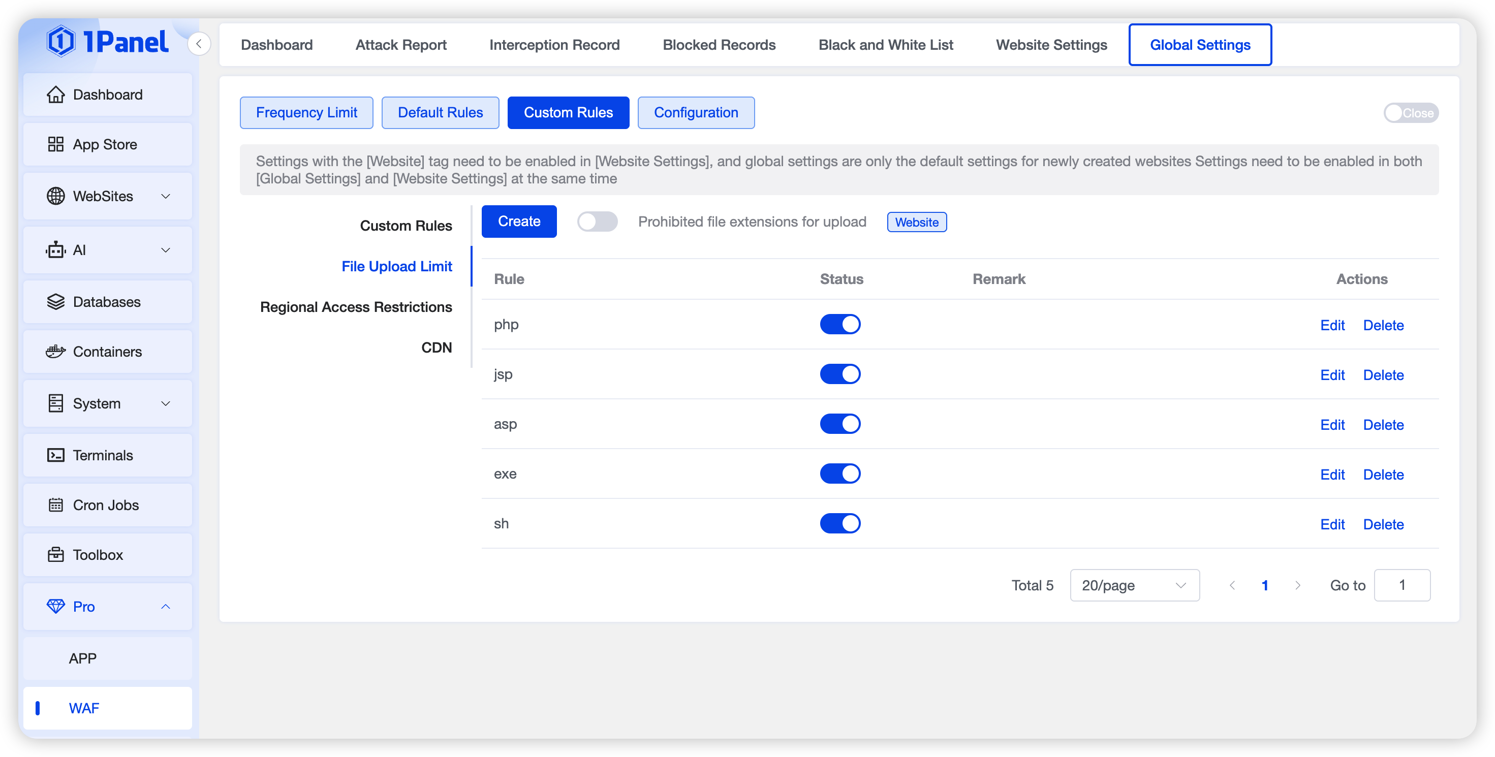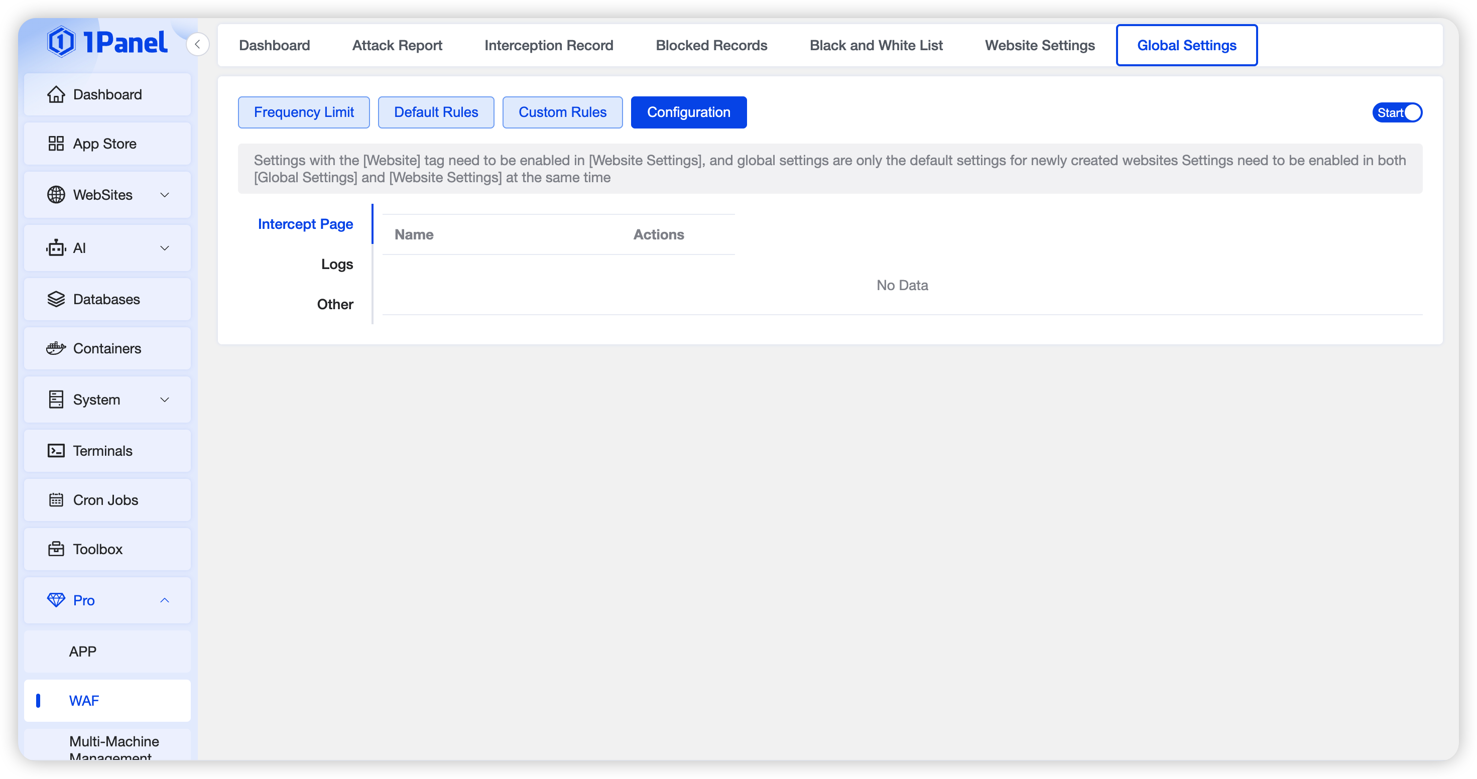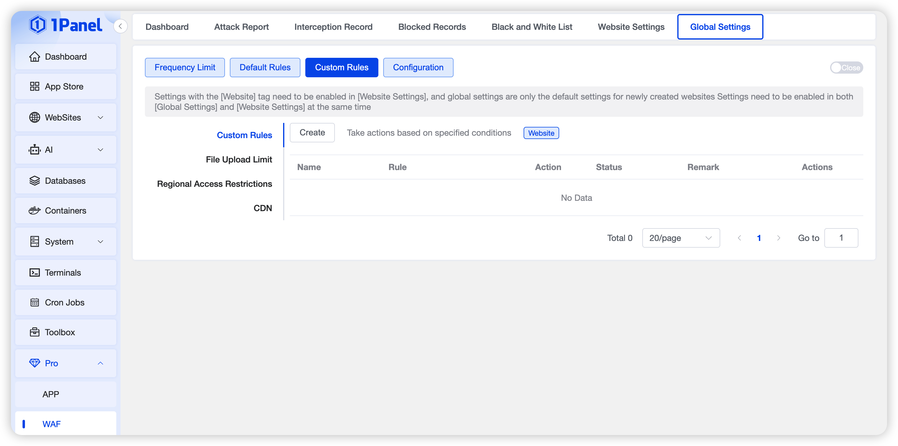 On the Global Settings page, you can view and configure WAF. It includes allowlists & blocklists, rate limits, default rules, custom rules, and advanced configurations.