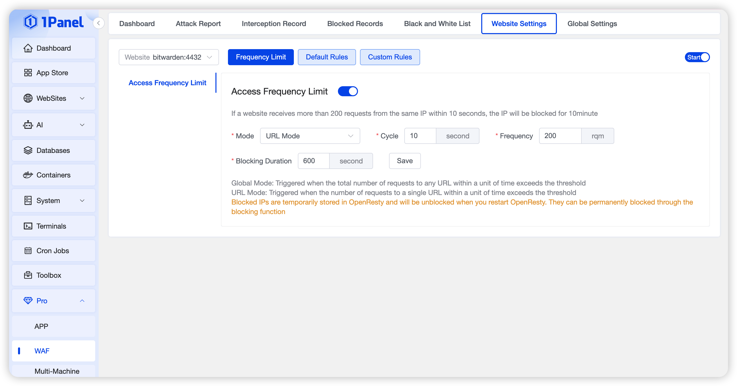 On the Website Settings page, you can view and configure WAF rules for a specific website. This includes rate limits, default rules, custom rules, and more.